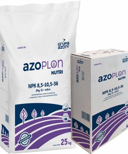 AZOPLON NUTRI 8,5-10,5-36 (Mg; S) + mikro to wieloskładnikowy, całkowicie rozpuszczalny w wodzie, bezchlorkowy nawóz krystaliczny o podwyższonej zawartości potasu. Wzbogacony magnezem, siarką oraz kompletnym zestawem mikroskładników chelatowanych EDTA zapewnia pełne i zbilansowane odżywienie roślin.