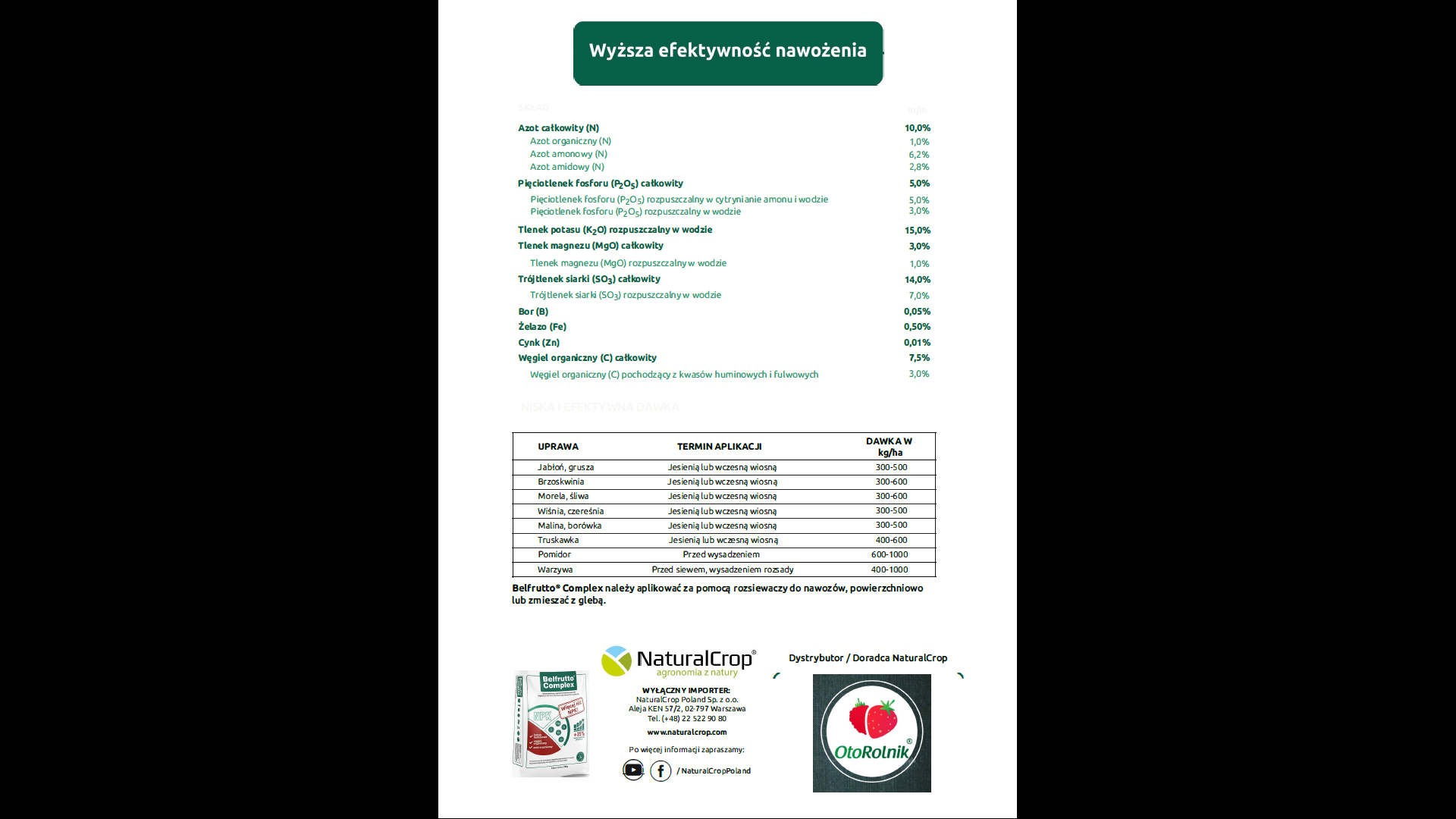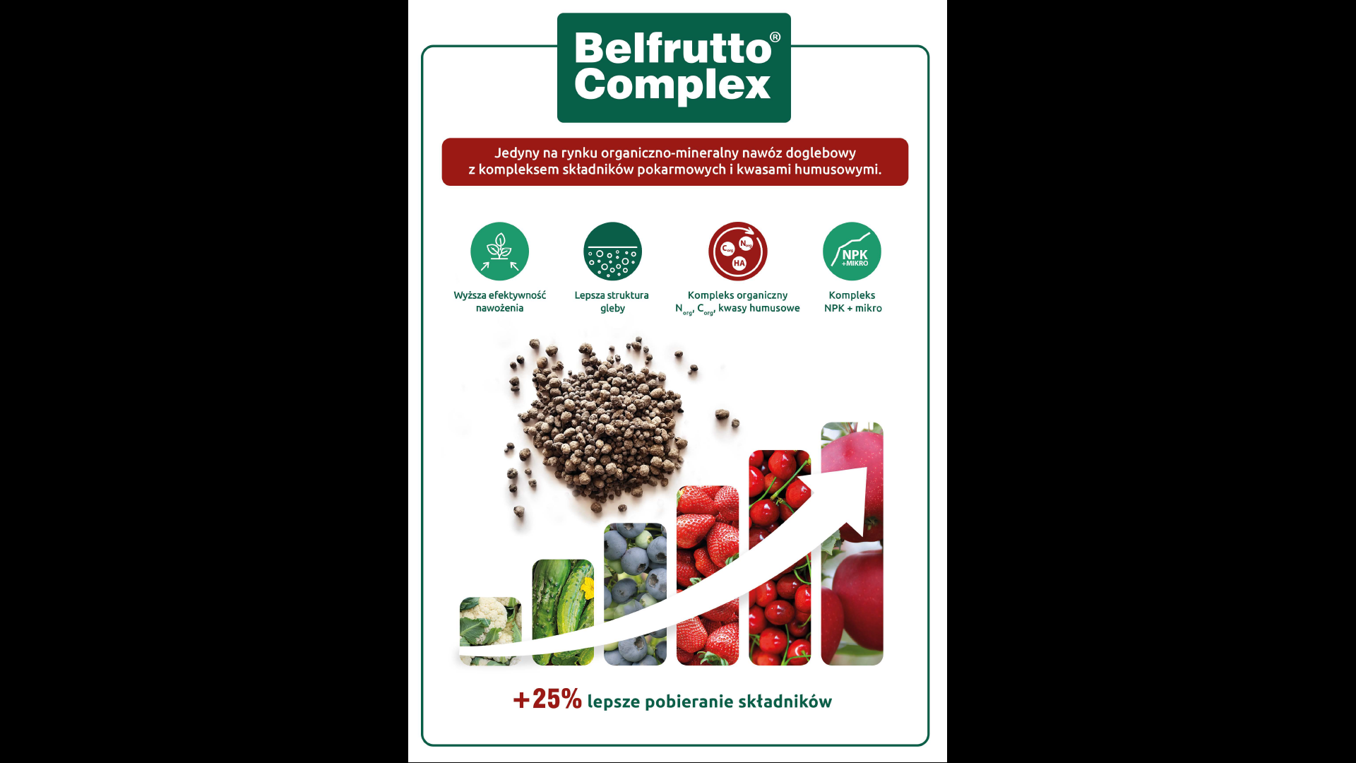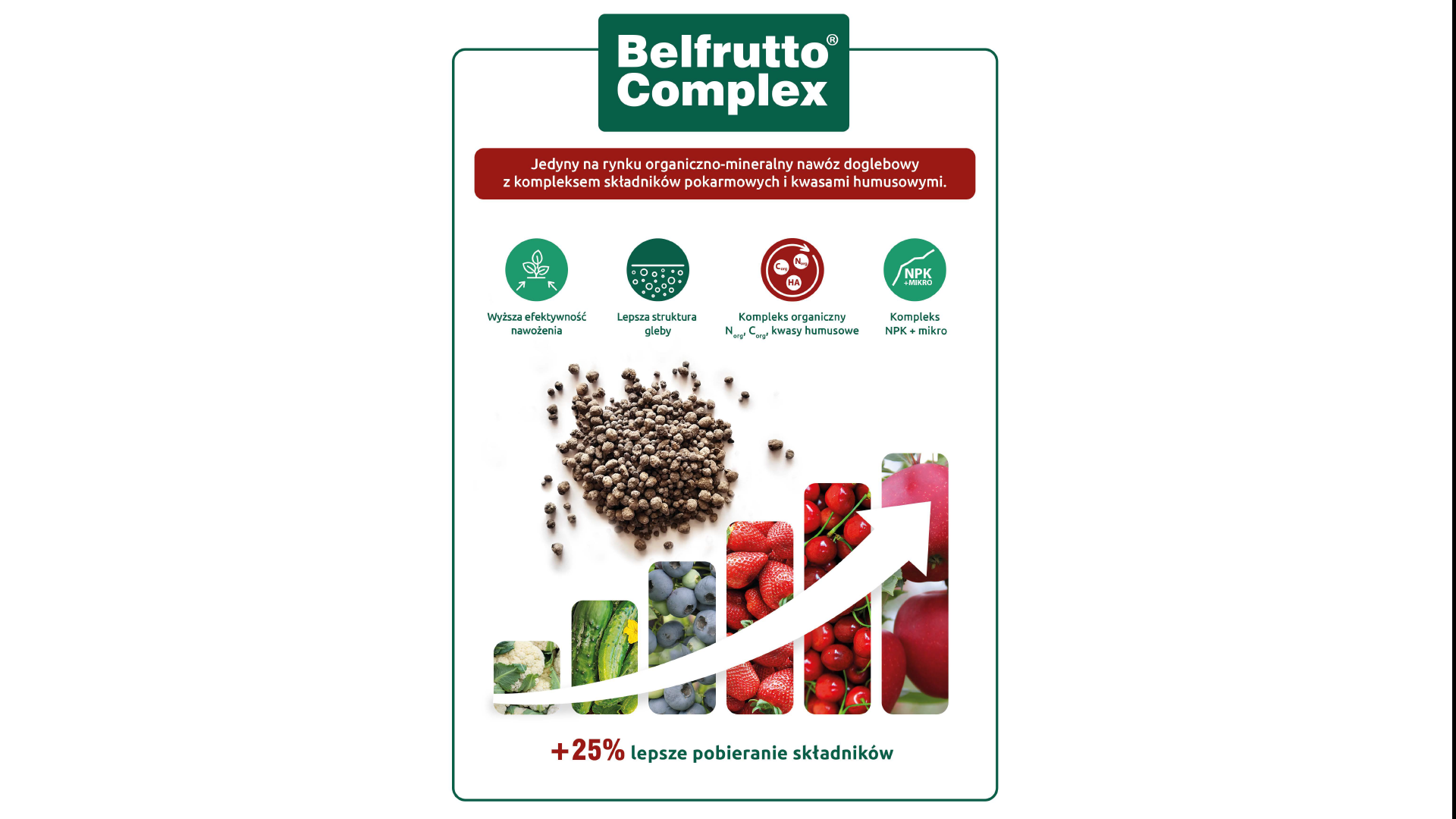 Belfrutto Complex to wieloskładnikowy nawóz doglebowy NPK (MgS) z dodatkiem kwasów humusowych, magnezu, siarki i mikroelementów (B, Fe, Zn). Przeznaczony jest do drzew i krzewów owocowych oraz warzyw, poprawia pobieranie składników odżywczych, wspiera rozwój systemu korzeniowego i mikroorganizmów glebowych, zwiększając wydajność upraw i zdrowotność roślin.