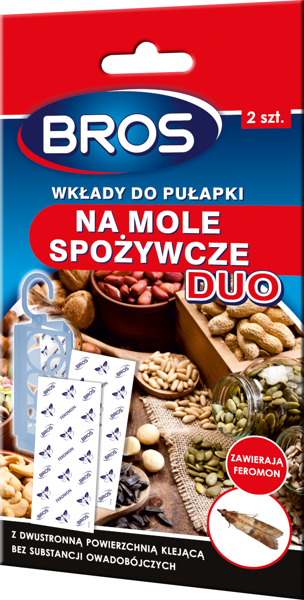 Wkłady do Pułapki na mole spożywcze DUO, przeznaczonej do monitorowania obecności tych owadów poprzez ich odławianie w kuchniach, spiżarniach i magazynach oraz bezpośrednio w szafkach kuchennych. Pułapka przyciąga mole na dwa sposoby: za pomocą dodanego do kleju feromonu oraz umieszczonej dodatkowo na dnie pułapki przynęty. Dzięki zastosowaniu dwustronnego lepu w plastikowej obudowie, owady mają łatwiejszy dostęp do powierzchni klejącej, co istotnie wpływa na skuteczność jej działania. Odłowione mole są mniej widoczne i nie ma ryzyka przyklejenia się do lepu produktów przechowywanych w szafce. Jest to produkt wielokrotnego użytku, który przy systematycznej wymianie klejowego wkładu, zapewnia ciągłe monitorowanie obecności moli spożywczych w kuchni. Jeden lep działa w naturalny sposób aż do 3 miesięcy.