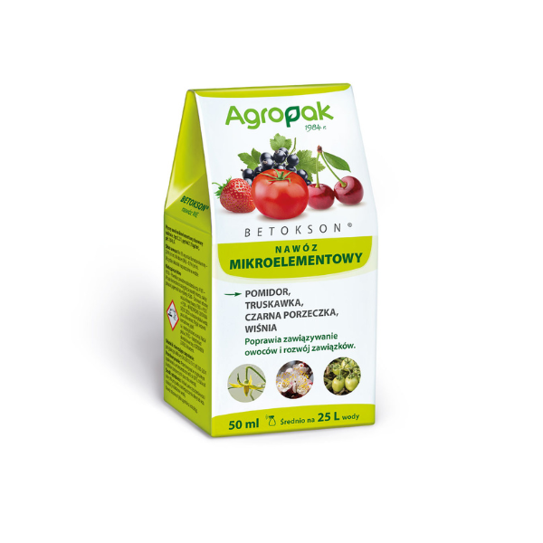 Betokson to płynny nawóz mikroelementowy i aktywator zawiązywania owoców. Preparat wspomaga prawidłowe tworzenie się zawiązków oraz ich rozwój, co przekłada się na zwiększone plonowanie roślin. Przeznaczony jest do stosowania w uprawie pomidora, truskawki, porzeczki czarnej i wiśni.