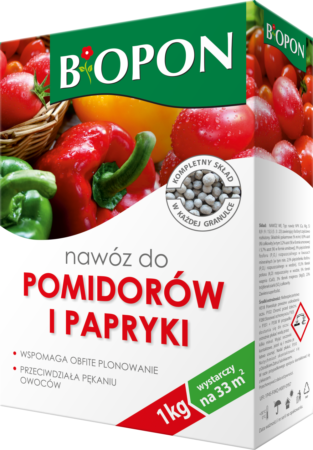 Wieloskładnikowy nawóz mineralny do pomidorów i papryki, uprawianych zarówno w gruncie jak i pod osłonami (szklarnie, tunele foliowe). Zawiera wszystkie substancje odżywcze potrzebne tym roślinom zarówno na etapie rozsad, jak i w okresie owocowania. Odpowiednia ilość fosforu zapewnia prawidłowe ukorzenienie sadzonek i wspomaga kwitnienie, a wysoka zawartość potasu sprzyja obfitemu plonowaniu pomidorów i papryki oraz przeciwdziała pękaniu owoców.