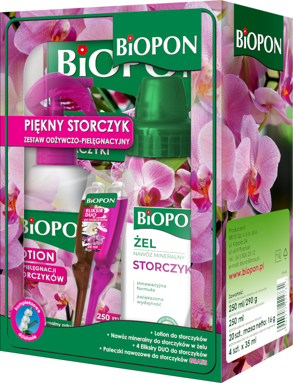 - Biopon eliksir DUO do storczyków odżywia i regeneruje 4x35ml - innowacyjny, dwuskładnikowy preparat przeznaczony do zasilania i szybkiej regeneracji wszystkich gatunków storczyków. Zalecany w szczególności do kwiatów z problemami (powolny wzrost, słabe kwitnienie, zeschnięte korzenie), różowa odżywka dostarcza storczykowi podstawowy pokarm, niezbędny do prawidłowego wzrostu i kwitnienia, a brązowy regenerator wzmacnia, redukuje stres wywołany przesadzaniem lub nieprawidłową pielęgnacją i przywraca mu ogólną równowagę