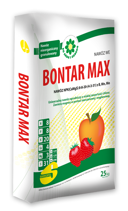 Bontar Max NPK (CaMgS) 8-8-20-(4-3-31+mikro) jest uniwersalnym nawozem ogrodniczym przeznaczonym do nawożenia drzew i krzewów owocowych oraz warzyw w uprawie polowej i pod osłonami. Nawóz może być wykorzystywany do przygotowania podłoża w uprawie warzyw i roślin ozdobnych pod osłonami oraz do posypowego nawożenia pogłównego. Bontar Max NPK (CaMgS) 8-8-20-(4-3-31+mikro) zawiera optymalny zestaw makroelementów i mikroskładników pokarmowych. Zróżnicowane formy azotu (amonowa i amidowa) zapewniają jego optymalne wykorzystanie. Potas w formie siarczanowej korzystnie wpływa jakość owoców i warzyw (wielkość, wygląd, kolor, smak, zapach) oraz zwiększa odporność na suszę, mróz i choroby.