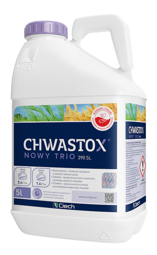 Chwastox Nowy Trio 390 SL to selektywny herbicyd o działaniu układowym, przeznaczony do zwalczania szerokiego spektrum chwastów w uprawach zbóż jarych i ozimych oraz na trawnikach, boiskach sportowych i polach golfowych. Stosowany nalistnie, w formie płynu do sporządzania roztworu wodnego. Aplikowany przy użyciu samobieżnych lub ciągnikowych opryskiwaczy polowych bądź opryskiwaczy ręcznych.