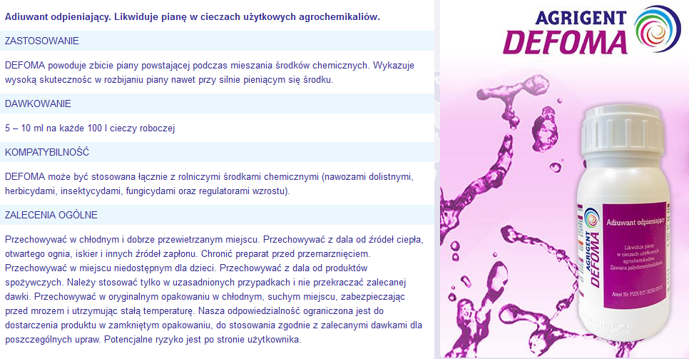 DEFOMA to specjalistyczny adiuwant przeznaczony do eliminacji piany powstającej podczas przygotowywania cieczy roboczej z udziałem nawozów dolistnych, herbicydów, insektycydów, fungicydów oraz regulatorów wzrostu. Środek jest gotowy do użycia, działa natychmiastowo i skutecznie, nawet przy bardzo niskich dawkach. Dzięki niskiej lepkości doskonale rozprasza się w cieczy, co ułatwia jego stosowanie i przyczynia się do sprawnego przebiegu prac polowych.