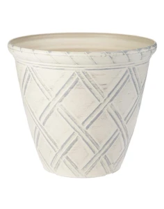 Wykonana z tworzywa sztucznego, lekka i pojemna donica Saly dostępna jest w trzech różnych kolorach: brązowym, kremowym oraz szarym. Wzór delikatnych, krzyżujących się ze sobą linii w stylu vintage definiuje jej zdecydowany charakter. Dzięki wysokiej jakości tworzywu sztucznemu, z którego donica została wykonana, jest ona przeznaczona do użytku zarówno do wnętrz jak i na tarasie czy w ogrodzie.