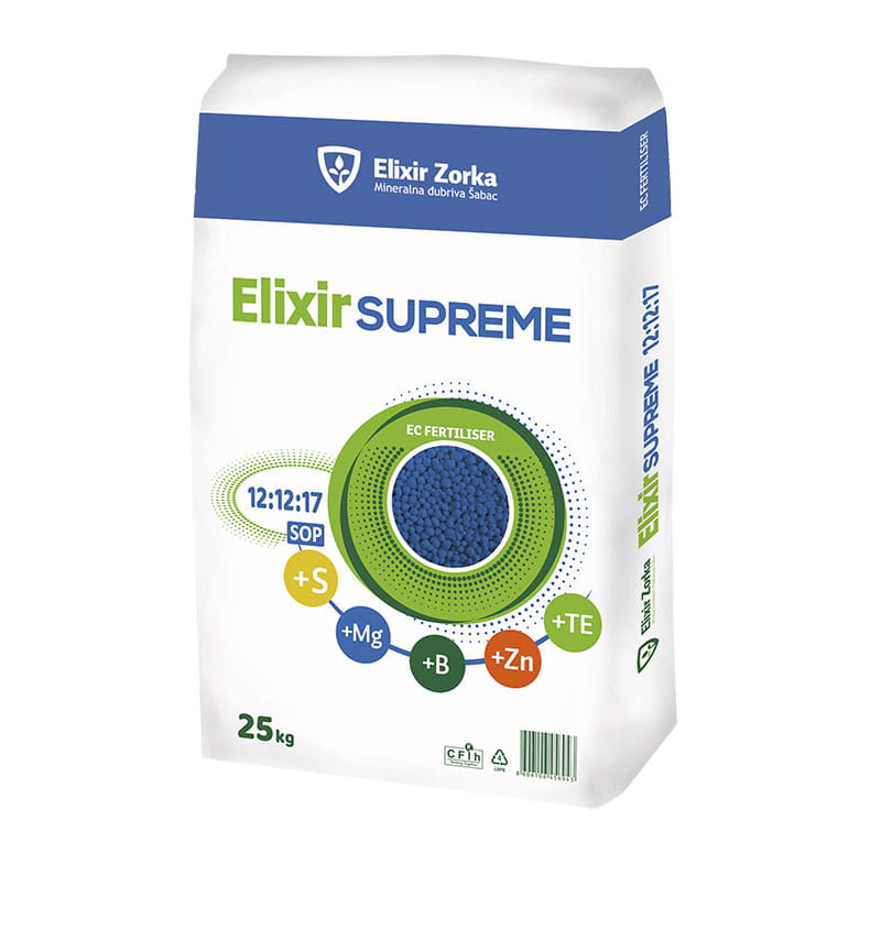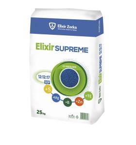 Elixir Supreme to bezchlorkowy, kompleksowy, nieorganiczny, stały nawóz mineralny o idealnym stosunku składników odżywczych pasujący do zastosowań w większości upraw wrażliwych na chlorki. Nawóz umożliwia zrównoważone odżywianie upraw ogrodniczych na wszystkich typach gleby. Dla wielu producentów, zwłaszcza tych nieposiadających informacji na temat zasobności ich gleb w składniki pokarmowe, nawóz Elixir Supreme 12-12-17 jest bardzo rozsądnym wyborem. Także u wielu profesjonalnych producentów warzyw i owoców jest miejsce na zastosowanie tego nawozu. Proporcje zawarte między makroskładnikami NPK w Elixir Supreme 12-12-17 są właściwe, zwłaszcza do nawożenie pogłównego sadów, jagodników i plantacji warzywniczych, ale i do zastosowanego tuż przed siewem czy sadzeniem warzyw, albo tuż przed startem wegetacji sadów i jagodników.