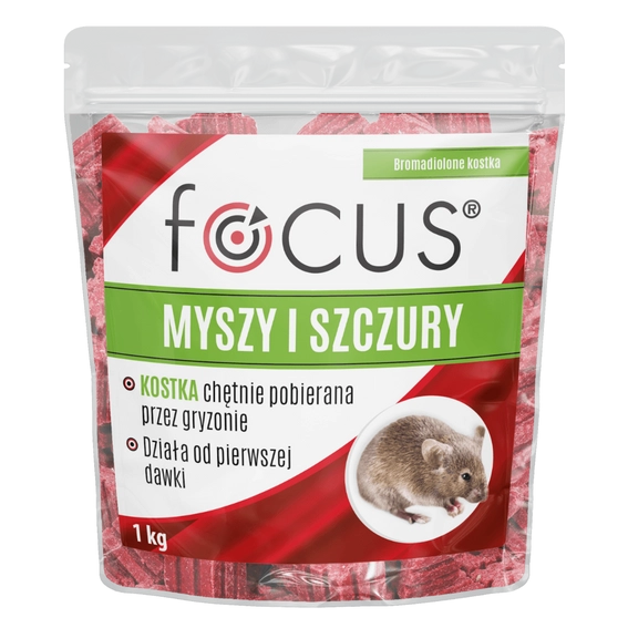 Focus kostka to nowoczesny preparat deratyzacyjny w postaci trwałych bloczków woskowych, skuteczny przeciwko szczurom, myszom i innym gryzoniom. Przynęta działa już od pierwszej dawki i wykazuje wysoką odporność na wilgoć, co umożliwia jej stosowanie również w wilgotnych miejscach. Forma kostki ułatwia bieżącą kontrolę pobierania przynęty. Kostka ma kształt sześcianu z frezowanymi bokami oraz wydrążony kanał do zawieszania na drucie w karmiku deratyzacyjnym. Ta forma jest bardziej trwała w porównaniu z granulatem i ziarnem.
