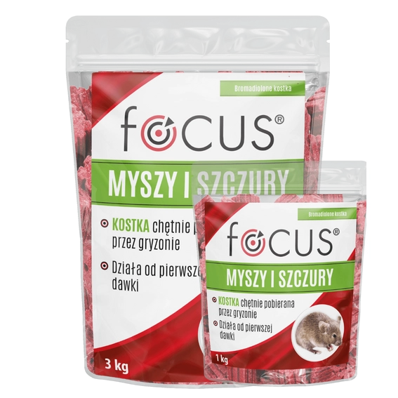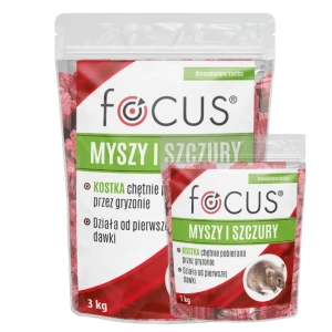 Focus kostka to nowoczesny preparat deratyzacyjny w postaci trwałych bloczków woskowych, skuteczny przeciwko szczurom, myszom i innym gryzoniom. Przynęta działa już od pierwszej dawki i wykazuje wysoką odporność na wilgoć, co umożliwia jej stosowanie również w wilgotnych miejscach. Forma kostki ułatwia bieżącą kontrolę pobierania przynęty. Kostka ma kształt sześcianu z frezowanymi bokami oraz wydrążony kanał do zawieszania na drucie w karmiku deratyzacyjnym. Ta forma jest bardziej trwała w porównaniu z granulatem i ziarnem.