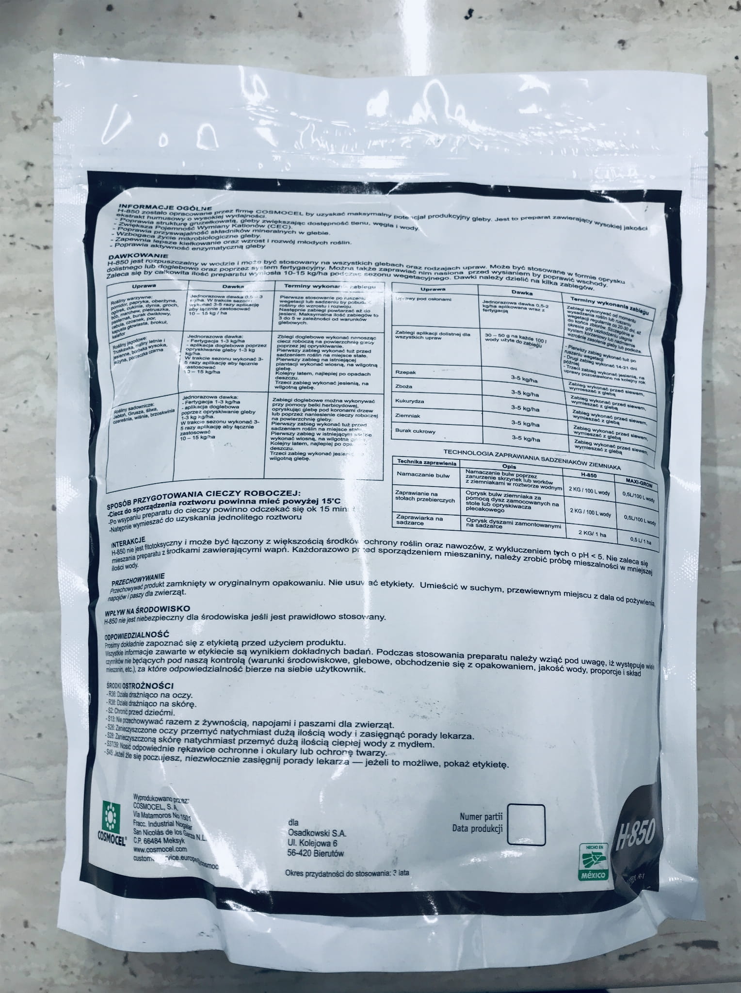 H-850 WG został opracowany przez firmę COSMOCEL w Meksyku, aby poprawiać właściwości fizyko-chemiczne gleb i podłoży. W swoim składzie zawiera starannie wyselekcjonowane, najwyższej jakości ekstrakty kwasów humusowych, dzięki temu już małe dawki produktu poprawiają jakość gleb w uprawach sadowniczych. Produkt jest pochodzenia naturalnego, nie powoduje negatywnego wpływu na środowisko naturalne ani rośliny uprawne. H-850 WG jest szeroko stosowany w uprawach rolniczych na kontynentach amerykańskich oraz w Europie. Od 2015 roku jest polecany w Polsce, gdzie prowadzone są liczne badania i testy nad wpływem H-850 WG na poprawę jakości gleby.