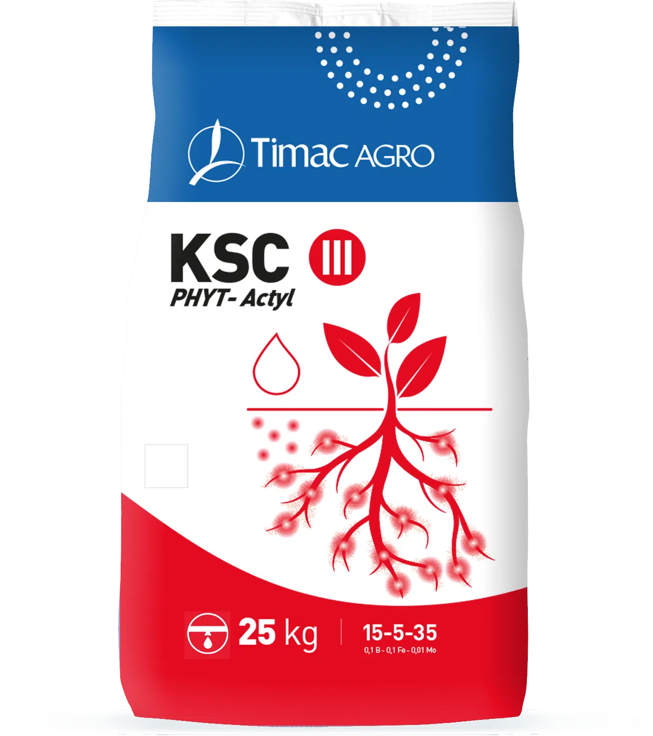 KSC III Czerwony to nawóz krystaliczny do fertygacji zawierający kompleks Phyt-Actyl. Kompleks ten to skoncentrowany wyciąg pochodzenia roślinnego o działaniu biostymulującym. Kompleks Phyt-Actyl zwiększa aktywność metaboliczną roślin dzięki zawartości prekursorów fitohormonów, substancji o działaniu biostymulującym i antystresowym, chelatowanych mikroelementów.