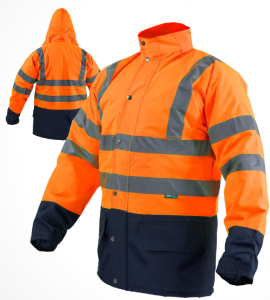 Kurtka wykonana jest z jaskrawego materiału i posiada elementy odblaskowe w postaci dwóch szerokich pasów, które zabezpieczają pracownika podczas pracy w złych warunkach pogodowych lub oświetleniowych.