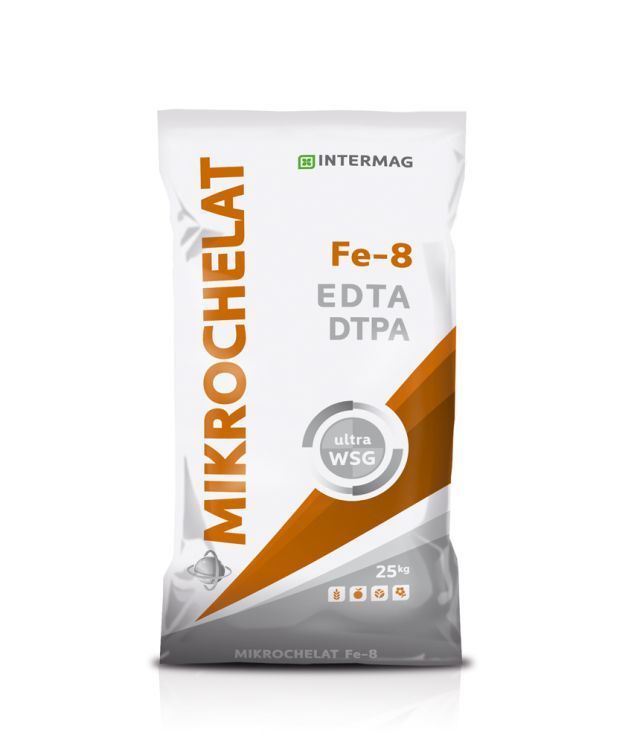 Mikrochelat Fe-8 zawiera 8% żelaza (Fe). Żelazo jest schelatowane przez EDTA+DTPA. Żelazo w formie chelatu jest szybciej wchłaniane, przemieszczane i przyswajane przez rośliny niż żelazo dostarczane roślinom w innych formach. Mikrochelat Fe-8 przeznaczony jest do stosowania w różnych technikach nawożenia: dokarmianie dolistne, fertygacja, oprysk/podlewanie gleby lub posypowo po zmieszaniu z innymi nawozami doglebowymi. Żelazo dostarczane roślinom w nawozie Mikrochelat Fe-8 jest: efektywnie i szybko pobierane przez rośliny z roztworów w dokarmianiu dolistnym, w zabiegach nawożenia wraz z nawadnianiem (fertygacja) oraz z gleby po nawożeniu doglebowym, bezpieczne dla roślin we wszystkich technikach stosowania (zgodnie z zalecanymi dawkami), stabilne w roztworach wieloskładnikowych (w zakresie do pH 8), stosowanych w zabiegach dolistnych, fertygacji i opryskach gleby.