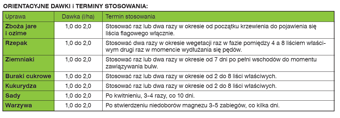 Zaleca się stosowanie nawozu w celu wyrównywania niedoborów magnezu w okresach największej wrażliwości roślin na brak dostępności tego składnika. MultiFol Mag jest unikalną formulacją, polegającą na skompleksowaniu jonów Mg i NO3 z kwasami humusowymi, która zapewnia transport składników pokarmowych do stożków wzrostu czyli tych części roślin, gdzie zapotrzebowanie jest największe a wykorzystanie najefektywniejsze. MultiFol Mag należy stosować w trakcie aktywnego wzrostu roślin.