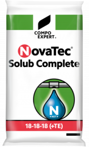 NovaTec Solub Complete 18-18-18 jest rozpuszczalnym w wodzie złożonym nawozem NPK z siarką. Ma zrównoważony stosunek składników pokarmowych, 8% amonu, 10% azotanów. Jest to nawóz z inhibitorem nitryfikacji DMPP (technologia NET), który zapewnia większą efektywność wykorzystania azotu, a także korzyści agronomiczne: większą wydajność, rozpuszczalność mikroelementów i wspieranie rozwoju bocznych rozgałęzień korzeni. Szczególnie dobrze sprawdza się w zakładaniu i pielęgnacji drzew owocowych oraz upraw ogrodniczych. Zawartość mikroelementów pozwala dostarczać roślinom potrzebnych substancji odżywczych i osiągać maksymalny plon. Doskonała rozpuszczalność nawozu zapobiega zatykaniu się kroplowników w czasie przeprowadzania zabiegu. Szczególna ostrożność jest zalecana przy stosowaniu z wodą, która nawet bez nawozu ma skłonność do tworzenia osadów.