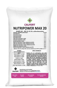 NutriPower Max 20 to mikrokrystaliczny nawóz dolistny rozpuszczalny w wodzie. Odczyn nawozu jest kwaśny (pH 2,5-3,5), dzięki czemu zakwasza wodę. Do produkcji nawozu użyto składników najwyższej jakości, które stymulują pobieranie i lepsze wykorzystywanie makro i mikroelementów. Nawóz nie zawiera chloru ani sodu, mikroelementy są schelatowane. NutriPower Max 20 jest nawozem specjalnie przygotowanym do zabiegów odżywiania dolistnego roślin rolniczych, warzywniczych, sadowniczych i jagodowych. Dzięki niskiemu pH może być mieszany z większością środków ochrony roślin oraz innymi nawozami.