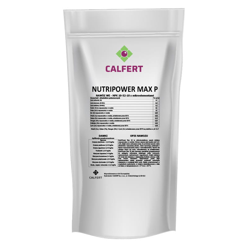 NutriPower Max P to mikrokrystaliczny nawóz dolistny rozpuszczalny w wodzie. Odczyn nawozu jest kwaśny (pH 2,5-3,5), dzięki czemu zakwasza wodę. Do produkcji nawozu użyto składników najwyższej jakości, które stymulują pobieranie i lepsze wykorzystywanie makro i mikroelementów. Nawóz nie zawiera chloru ani sodu, mikroelementy są schelatowane. NutriPower Max P jest nawozem specjalnie przygotowanym do zabiegów odżywiania dolistnego roślin rolniczych, warzywniczych, sadowniczych i jagodowych. Dzięki niskiemu pH może być mieszany z większością środków ochrony roślin oraz innymi nawozami. Każdorazowo przed jego zastosowaniem należy sprawdzić możliwość wykonania mieszaniny w mniejszej ilości wody.