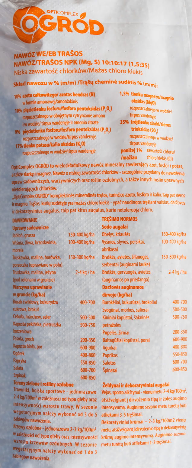 Mineralny nawóz wieloskładnikowy z azotem, fosforem, potasem oraz siarką, z dodatkiem magnezu. OptiComplex Ogród charakteryzuje się niską zawartością chlorków, dzięki czemu może być z powodzeniem stosowany w uprawach, które ich nie tolerują.