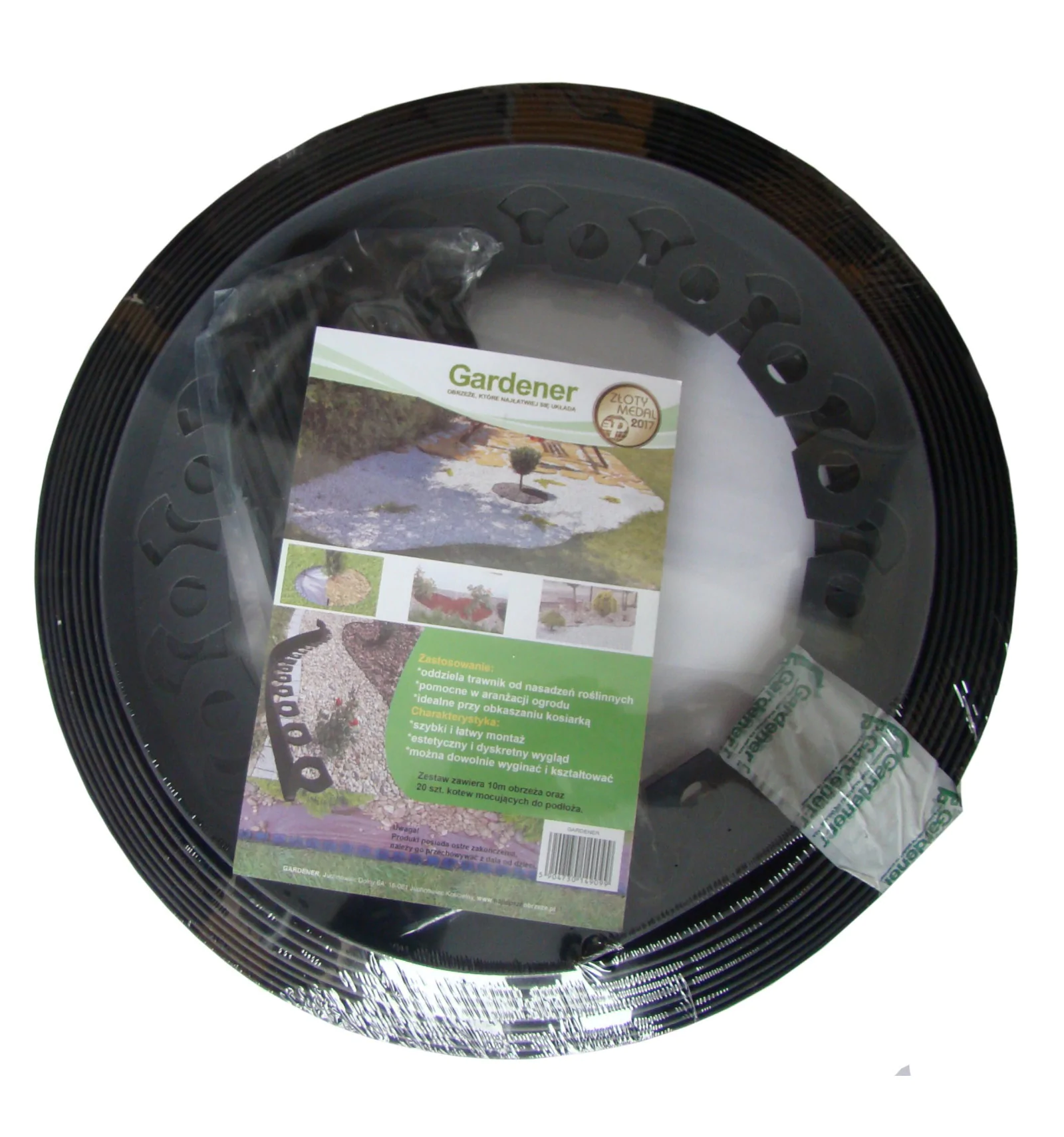 Otrzymało Złoty Medal - Międzynarodowych Targów Ogrodniczych GARDENIA 2017 Obrzeże Gardener to innowacyjny produkt, niezwykle elatyczny, który pozwala na ułożenie podłoża 10m bez łączenia krótkich kawałków w całość. Jest to obrzeże w jednym kawałku, nie trzeba go przecinać aby zrobić koło, łuk. Idealne do tworzenia pięknych, niepowtarzalnych aranżacji w ogrodzie. Nadaje się do oddzielenia trawników od ścieżki, kory drzewnej, nawierzchni grysowej, rabat kwiatowych, również części uprawnej ogrodu. Brak ryzyka uszkodzenia produktu przez kosiarkę – obrzeże powinniśmy zamontować w taki sposób, by nie wystawało ono więcej niż 1 cm nad powierzchnię. Dzięki takiej czynności będzie ono niewidocznym elementem nawierzchni.Obrzeże wykonane zostało z wysokiej jakości tworzywa sztucznego, które odporne jest na warunki atmosferyczne. Dlaczego warto kupić ten produkt: - można dowolnie wyginać i kształcić- obrzeże 10m w jednym kawałku!- w zestawie dodane są mocne szpilki 20szt. o długości 24 cm - niezwykle łatwe układanie, wysoka elastyczność tworzywa- płytki rowek do ułożenia obrzeża: do 4cm- doskonale oddziela materiały, np. trawnik od grysu- przepięknie eksponuje ozdobne klomby- wytrzymałość temperaturowa: od -30 stopcji Celcjusza do +50 stopni Celcjusza.