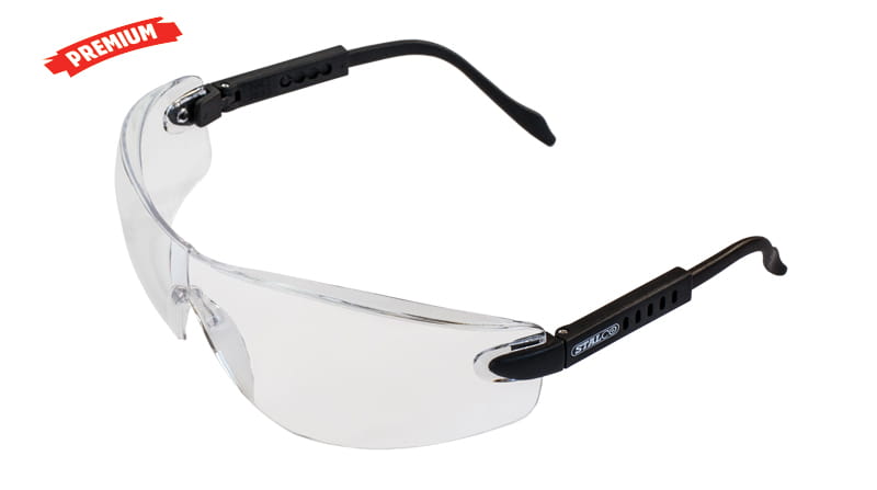 Bezbarwne soczewki z tworzywa sztucznego zapewniają ochronę przed szybkoporuszającymi się cząsteczkami o niskiej energii.