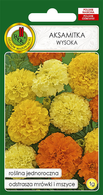 Mieszanka odmian o kwiatach żółtych i pomarańczowych typu goździkowego o średnicy 7-12 cm. Są to rośliny jednoroczne o bujnym wzroście. Kwitnie długo i obficie od maja do października. Wysiewamy ją w kwietniu pod osłonami lub w maju wprost do gruntu. Doskonała na rabaty i na kwiat cięty. Posiada właściwości ochronne - odstrasza nicienie. Udaje się na każdej glebie ogrodowej.