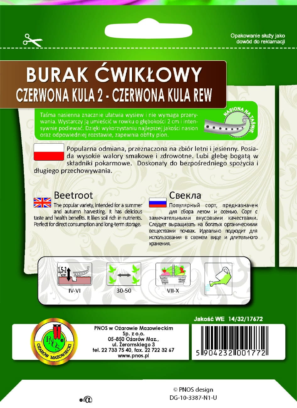 Burak ćwikłowy Czerwona Kula 2 – nasiona na taśmie, to odmiana o okresie wegetacji od 110-115 dni, bardzo plenna. Jest to popularna odmiana, przeznaczona na zbiór letni i jesienny. Posiada wysokie walory smakowe i zdrowotne. Tworzy kuliste korzenie, dobrze wykształcone, o średnim skorkowaceniu. Miąższ ma barwę ciemnoczerwoną, jest dobrze wybarwiony Lubi glebę bogatą w składniki pokarmowe. Doskonały do bezpośredniego spożycia i długiego przechowywania. Wysiew nasion z taśmy znacznie ułatwia uprawę roślin. Dzięki tej metodzie, nie trzeba przerywać roślin. Taśmę należy umieścić w rowku o głębokości 2cm i intensywnie podlewać. Dzięki wykorzystaniu najlepszych nasion oraz odpowiedniej rozstawie zapewnimy sobie obfity plon.