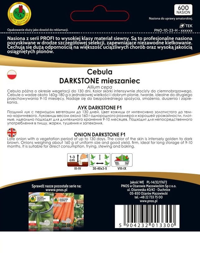 Cebula późna o okresie wegetacji do 130 dni. Kolor skórki intensywnie złocisty do ciemnobrązowego. Cebule o wadze około 160g o jednakowej wielkości i dobrym plonie, twarde, idealne do długiego przechowywania: 9-10 miesięcy. Nadaje się do bezpośredniego spożycia, smażenia, duszenia i zapiekania.