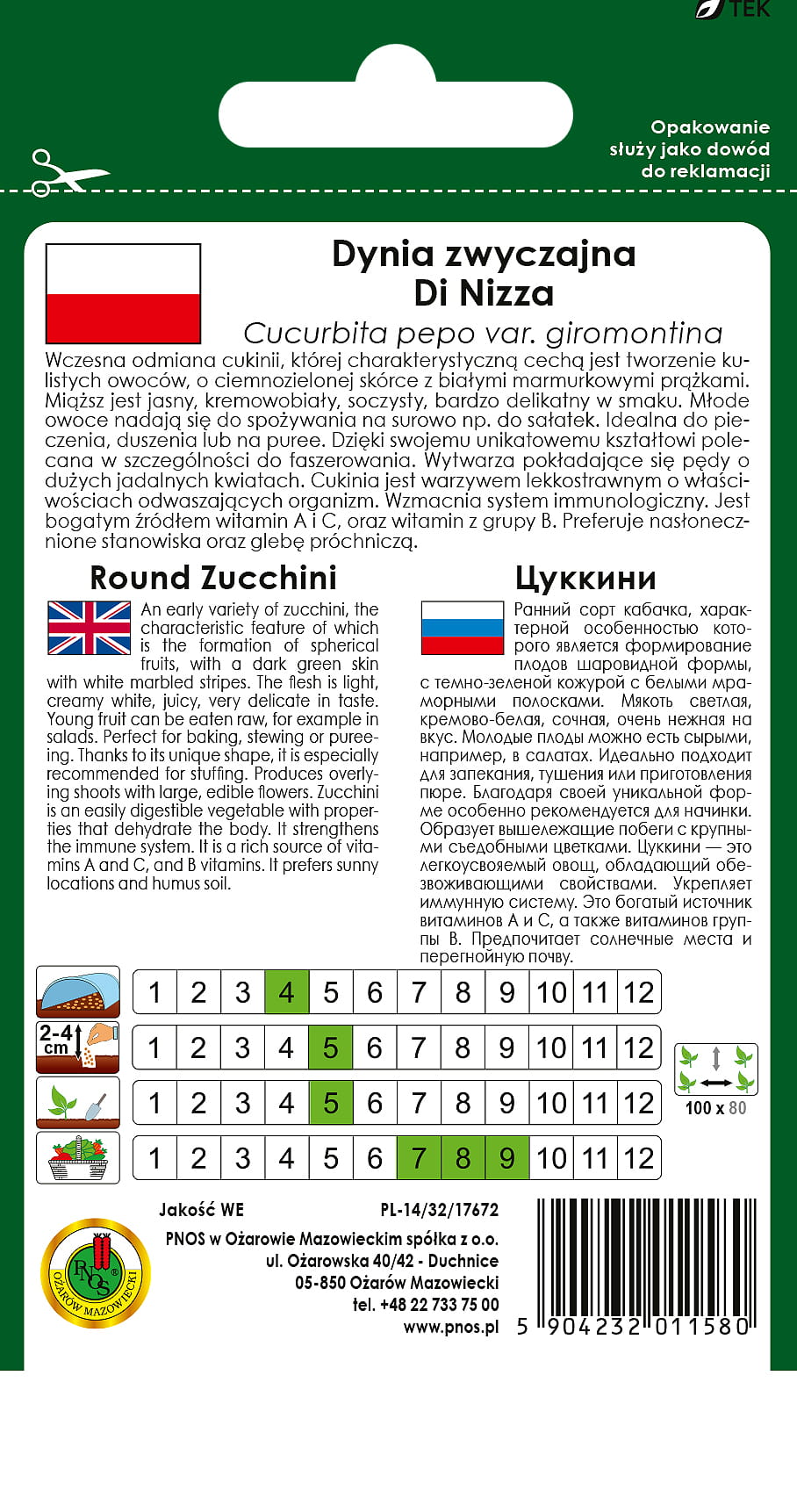 To wczesna odmiana, której charakterystyczną cechą jest tworzenie kulistych owoców, o ciemnozielonej skórce z białymi marmurkowymi prążkami. Miąższ jest jasny, kremowobiały, soczysty, bardzo delikatny w smaku. Młode owoce nadają się do spożywania na surowo np. do sałatek. Idealna do pieczenia, duszenia lub na puree. Dzięki swojemu unikatowemu kształtowi polecana w szczególności do faszerowania. Wytwarza pokładające się pędy o dużych jadalnych kwiatach. Cukinia jest lekkostrawna, ma działanie odkwaszające, wzmacnia system immunologiczny, jest bogatym źródłem witamin A i C, oraz witamin z grupy B. Lubi nasłonecznione stanowiska, glebę próchniczą, nie lubi zbytniego nawilgocenia.