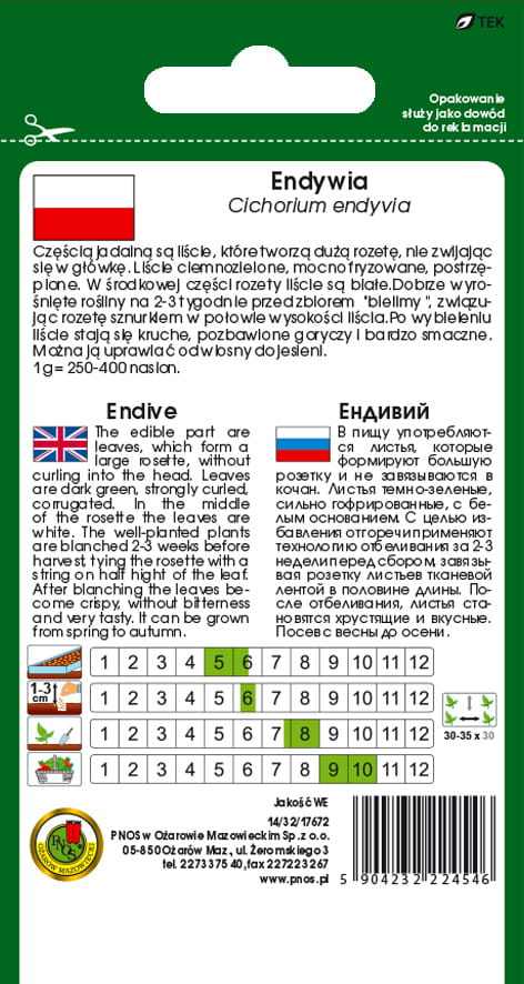 Częścią jadalną są liście, które tworzą dużą rozetę, nie zwijając się w główkę. Liście ciemnozielone, mocno fryzowane, postrzępione. W środkowej części rozety liście są białe. Wyrośnięte rośliny na 2-3 tygodnie przed zbiorem 'bielimy', związując rozetę sznurkiem w połowie wysokości liści. Po wybieleniu liście są kruche, pozbawione goryczy i bardzo smaczne. Można ją uprawiać od wiosny do jesieni.