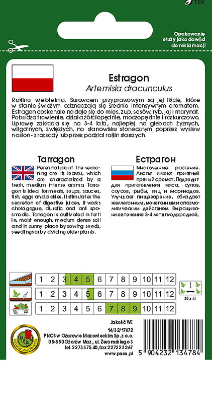 Roślina wieloletnia. Surowcem przyprawowym są jej liście, które w stanie świeżym odznaczają się średnio intensywnym aromatem. Estragon doskonale nadaje się do mięs, zup, sosów, ryb, jaj i marynat. Pobudza trawienie, działa żółciopędnie, moczopędnie i rozkurczowo. Uprawę zakłada się na 3-4 lata, najlepiej na glebach żyznych, wilgotnych, zwięzłych, na stanowisku słonecznym poprzez wysiew nasion - z rozsady lub przez podział roślin starszych.