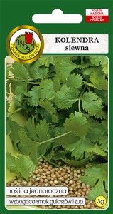 Roślina jednoroczna. Częścią jadalną są owoce o korzennym zapachu. Idealna do tłustych mięs i pasztetów oraz do marynowania ogórków, buraków, grzybów oraz wypieku pierników. Poprawia trawienie, ma działanie przeciwskurczowe i przeciwbakteryjne. KOLENDRA SIEWNA preferuje stanowisko suche, dobrze nasłonecznione.Uprawa z siewu wprost do gruntu.