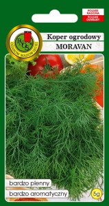 Koper ogrodowy Moravan to odmiana późna (okres wegetacji wynosi od 70 do 80 dni). Łodygi gęsto ulistnione, liście niebieskozielone ze srebrnym nalotem, odporny na wybijanie w pędy kwiatostanowe. Moravan ceniony jest za niezawodne, obfite plonowanie. Pozyskiwane z niego zbiory cechują się dobrą jakością i skłonnością do rozkrzewiania. Osiąga do 1m wysokości.