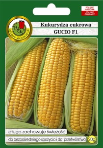 Kukurydza cukrowa Gucio F1 to wczesna odmiana mieszańcowa, charakteryzująca się niezwykle słodkim smakiem. Okres wegetacji tej kukurydzy trwa około 110–120 dni. Roślina osiąga do 170cm wzrostu, tworzy cylindryczne kolby o długości do 25cm i średnicy około 5cm. Liście na kolbach są na tyle zwięzłe, że solidnie je otulają, wręcz zamykają. Ziarna przybierają ładny, regularny kształt i ubarwiają się na kolor żółty z odcieniem pomarańczowym.