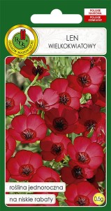Jednoroczna roślina o delikatnych pędach i czerwonych, dużych kwiatach osiągających średnicę 5cm. Nasiona lnu wielkokwiatowego wysiewamy od kwietnia do czerwca wprost do gruntu, gdyż nie znosi przesadzania. Kwitnie w okresie czerwiec-sierpień. Doskonały na niskie rabaty. Dobrze rośnie na każdej glebie. Nie jest wymagający.