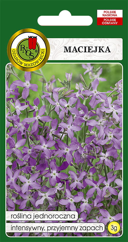 Maciejka charakteryzuje się silnie rozgałęzionymi pędami o szorstkiej powierzchni. Jej wysokość dochodzi do 30-40cm, liście są małe, lancetowate i matowe, pokryte kutnerem. Kwiaty czteropłatkowe, jasnofioletowe, zebrane w grona, o silnym, przyjemnym zapachu, otwierające się pod wieczór. Maciejkę można uprawiać w prawie każdej glebie, na stanowisku słonecznym do pół cienistego. Rozmnażamy ją z nasion, wysiewanych wprost do gruntu pod koniec kwietnia, przerywamy tak, aby odstępy wyniosły około 10cm pomiędzy roślinami. Roślina nie powtarza kwitnienia, dlatego możemy ją wysiać kilkukrotnie, co 2-3 tygodnie. Wówczas zapewnimy sobie ciągłość kwitnienia.