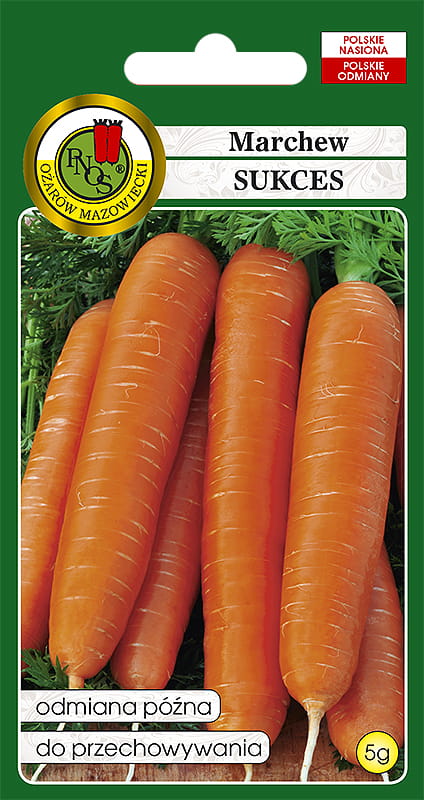 Odmiana późna, jej okres wegetacji trwa około 5 miesięcy. Marchew Sukces jest słodka, ładnie wybarwiona, lekko stożkowate korzenie należą do największych na naszym rynku – osiągają długość od 22-26cm. Gładka skórka ma kolor ciemnopomarańczowy, zaś miąższ przyjmuje odcień nieco jaśniejszy, ale za to jest równomiernie zabarwiony.