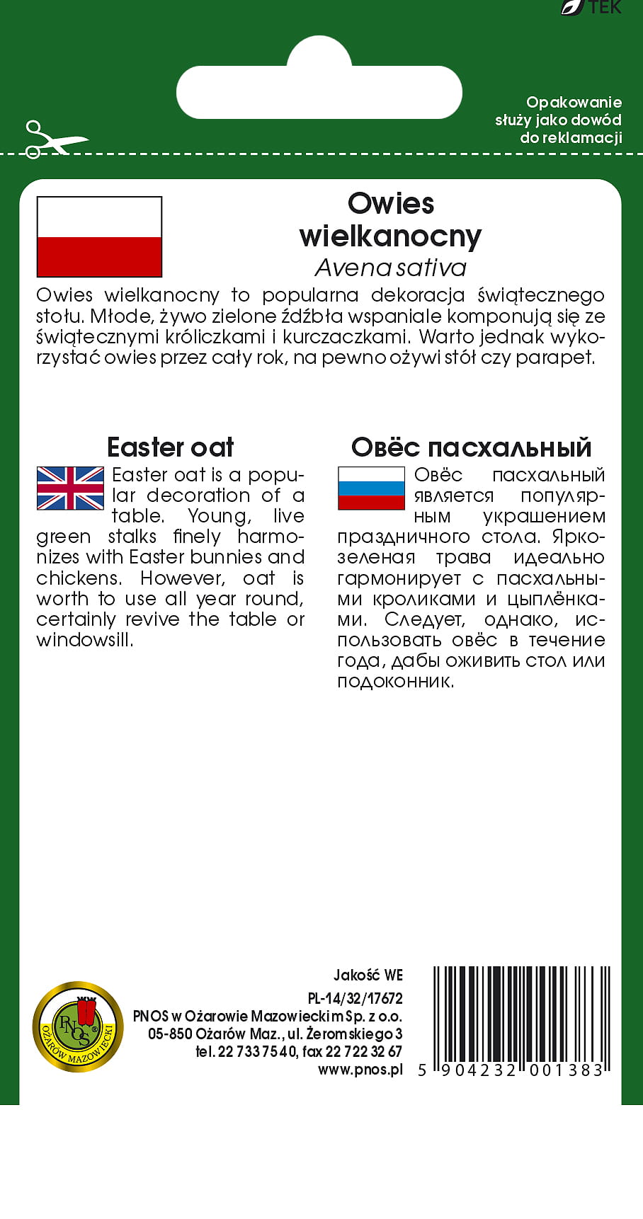 Owies wielkanocny w ciągu 8-12 dni urośnie do wysokości ok. 10 cm. Utrzyma się tak około dwa tygodnie.