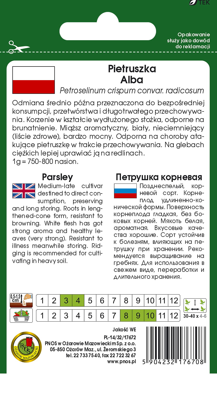 Odmiana średnio późna przeznaczona do bezpośredniej konsumpcji, przetwórstwa i długotrwałego przechowywania. Korzenie w kształcie wydłużonego stożka, odporne na brunatnienie. Miąższ aromatyczny, biały, nieciemniejący, bardzo mocny. Odporna na choroby atakujące pietruszkę w trakcie przechowywania. Na glebach ciężkich lepiej uprawiać ją na redlinach.
