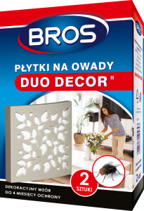Dwie dekoracyjne płytki do zwalczania mrówek i owadów latających (muchy, komary, meszki, muszki owocówki i dorosłe osobniki moli odzieżowych) w pomieszczeniach. Mogą być stosowane razem lub osobno, w zależności od wielkości zabezpieczanej powierzchni. Subtelny, elegancki wzór w połączeniu z dyskretnym kolorem sprawiają, że płytki Duo-Decor pasują do każdego pomieszczenia. Płytka zaczyna działać od razu po rozpakowaniu, uwalniając stopniowo substancje aktywne, które wnikają w szczeliny i likwidują nawet głęboko ukryte owady. Pełna skuteczność występuje po ok. 48 godz. od jej wystawienia. Płytki stosowane jedna po drugiej, skutecznie chronią pomieszczenie aż do 4 miesięcy (obie płytki zapakowane są w oddzielne opakowania foliowe, które zabezpieczają substancję czynną przed jej uwalnianiem).