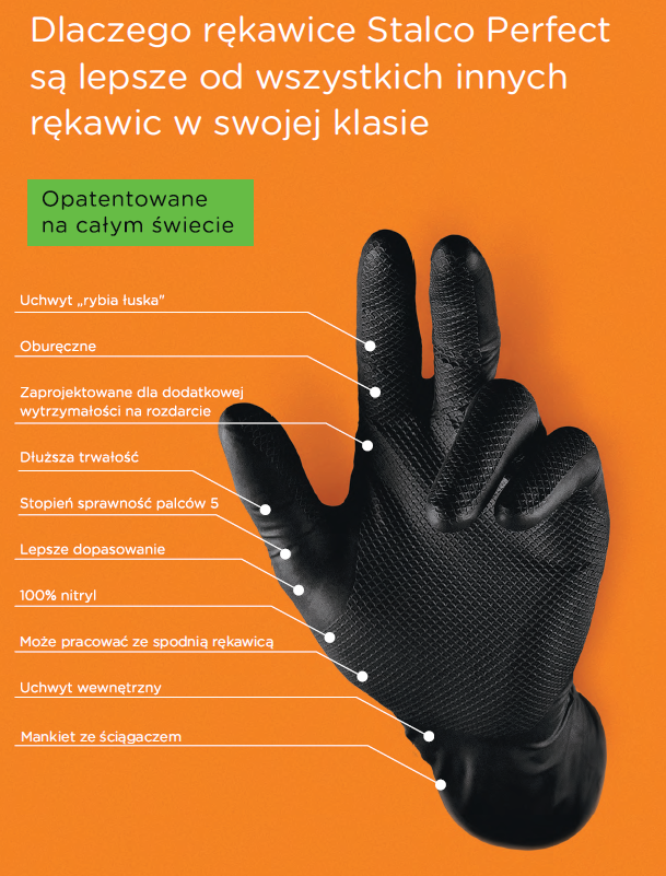 Rękawice bezpudrowe, wykonane z nitrylu (kauczuku butadienowo-nitrylowego (NBR)–syntetyczne). Rękawica teksturowana, innowacyjna,obustronna perforacja w kształcie rybiej łuski. Dobre dopasowanie do dłoni użytkownika.
