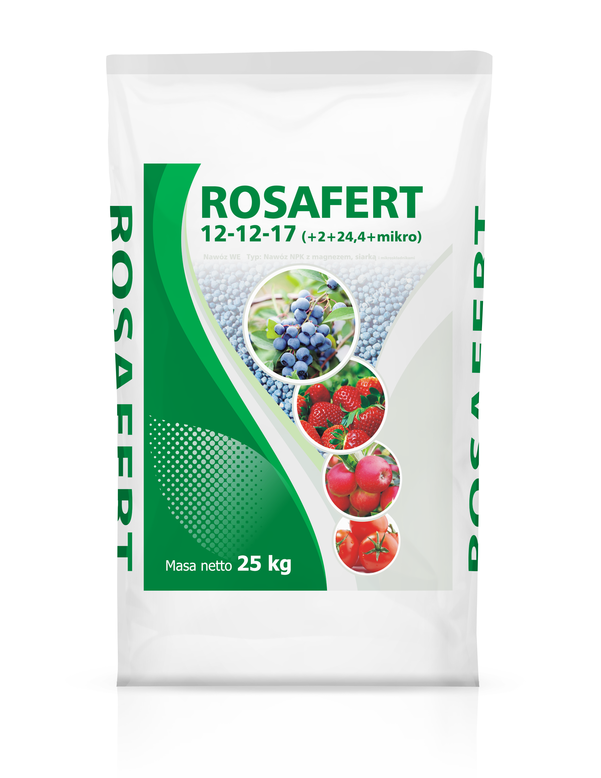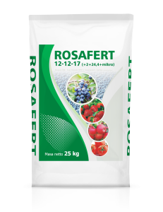 Rosafert 12-12-17 (+2+24,4+mikro) jest bezchlorkowym, granulowanym nawózem NPK z magnezem, siarka i mikroskładnikami pokarmowymi przeznaczony do nawożenia warzyw, drzew i krzewów owocowych, szkółek, roślin ozdobnych i trawników.