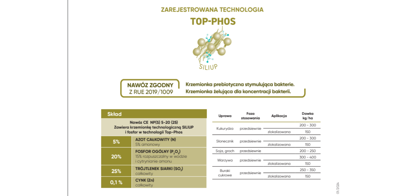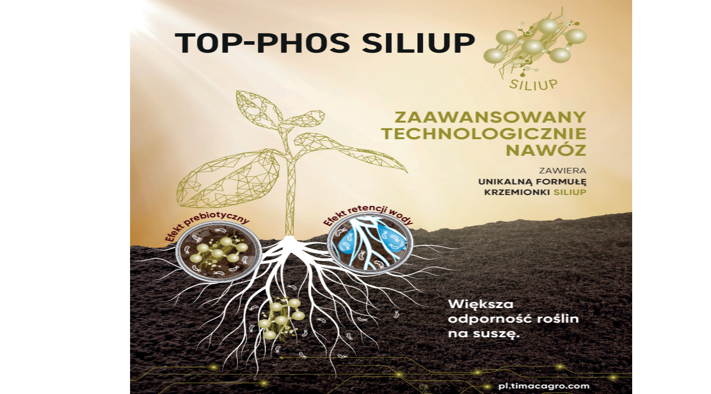 Dzięki innowacyjnemu procesowi produkcyjnemu, SILIUP jest unikalną formą zaawansowanej technologicznie krzemionki, działającej w synergii z Top-Phos, która aktywuje proces obiegu krzemu w glebie. Ten składnik obficie występujący w glebach mineralnych i organicznych jest trudno dostępny dla roślin, ale może stać się osiągalny dzięki działaniu bakterii, które są stymulowane przez technologię SILIUP. Krzemionka zastosowana w nawozie SILIUP jest specjalnie sformułowana w procesie technologicznym i wykazuje dwa sposoby działania. Si – biot, to krzemionka prebiotyczna stymulująca bakterie, które rozpuszczają w glebie krzem mineralny oraz bakterie odpowiedzialne za mineralizację krzemu zawartego w resztkach roślinnych. Dzięki intensyfikacji ich aktywności z form trudno dostępnych uzyskujemy krzem w postaci kwasu ortokrzemowego, który z powodzeniem mogą wykorzystywać rośliny. Drugi sposób działania to krzemionka żelująca Si -gel, która wpływa na tworzenie struktury trójwymiarowej polimerów, w obrębie których gromadzona jest woda, niezbędna dla funkcjonowania mikroorganizmów glebowych m.in. bakterii uruchamiających krzem. W następstwie tego działania rośliny są dużo lepiej zaopatrzone w krzem, który odgrywa ogromną rolę w osmoregulacji komórek roślinnych, wzmaga się percepcja światła, a z nią efektywność fotosyntezy. Dobre zaopatrzenie roślin w ten pierwiastek wzmacnia odporność roślin na stresy. Krzem wpływa na sprawną regulację działania aparatów szparkowych ograniczając transpirację. Liczne badania naukowe potwierdzają również synergistyczne działanie tego pierwiastka na pobieranie pozostałych składników odżywczych m.in. N, P, K, S, Mg. Co w prosty sposób przekłada się na uzyskiwane plony oraz ich jakość. Wysycenie krzemem organów roślinnych wpływa na większą sztywność ścian komórkowych dzięki czemu minimalizujemy ryzyko wylegania oraz zwiększamy odporność roślin na ekspansję szkodników oraz infekcje patogenów wzmacniając barierę mechaniczną.