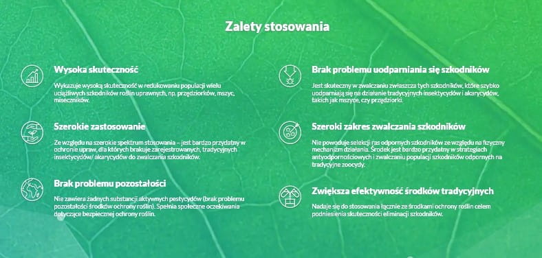 Nie wywołuje działania toksycznego chemicznie, nie powoduje odporności u szkodników.