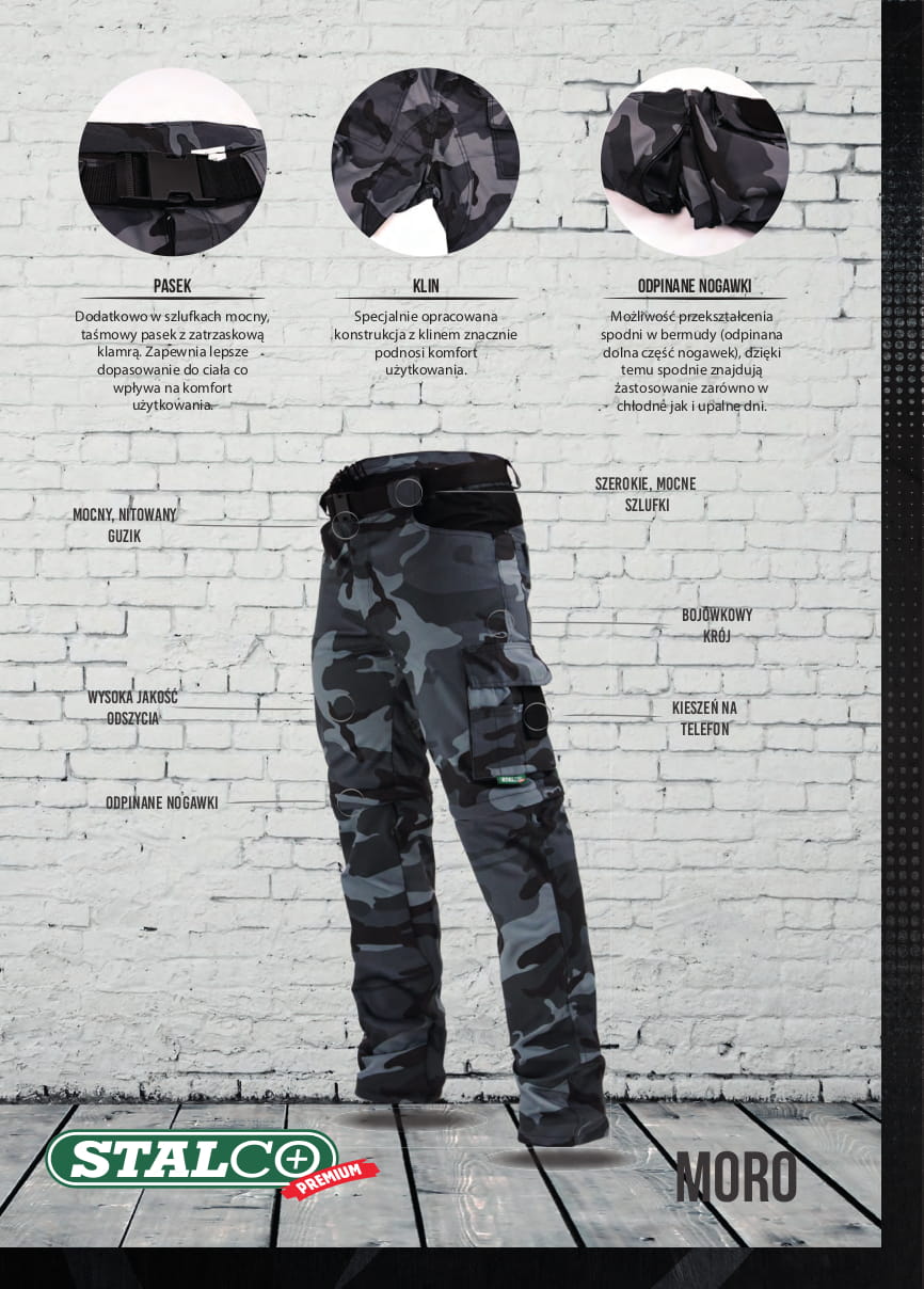 z podwójnymi szwami, wykonane z porządnej mieszanki poliestru i bawełny o dobrej gramaturze 245g/m2, zostały wyprodukowane w Polsce. Spodnie ochronne Moro posiadają specjalnie opracowaną konstrukcję z klinem, która znacznie podnosi komfort użytkowania oraz dodatkowo posiada dodatkowe rygle zabezpieczające miejsca najbardziej podatne na rozprucie.