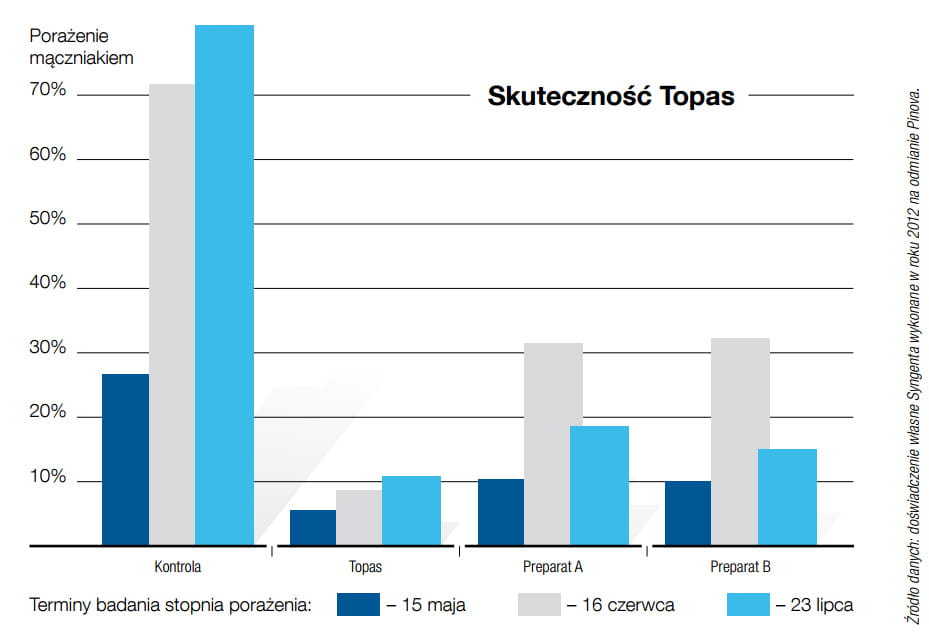 Topas 100 EC działa systemicznie, wnikając do wnętrza rośliny i przemieszczając się wraz z sokami, co zapewnia ochronę także nowych przyrostów.
