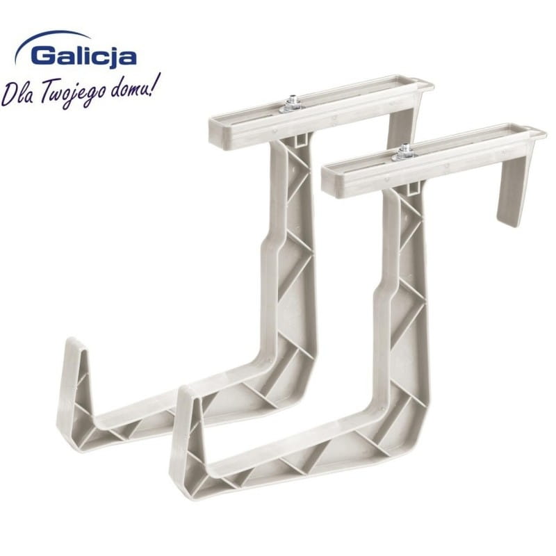 Dwa uniwersalne, wykonane z mocnego tworzywa sztucznego uchwyty przeznaczone do skrzynek balkonowych. Dzięki temu, że uchwyty posiadają regulacje, z łatwością można dopasować je do różnych rodzajów balustrad i poręczy. Dwa solidne wieszaki wystarczają do doniczek nie przekraczających 80 cm długości.