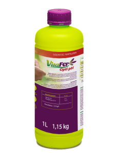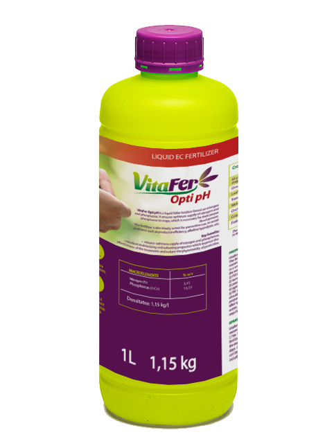 VitaFer Opti pH jest płynnym nawozem stosowanym jako srodek zakwaszajacy i bufor, który pozwala poprawic jakosc wody uzywanej do oprysku dolistnego oraz rozwiazac problemy zwiazane z twardoscia wody i wysokim pH. VitaFer Opti pH pozwala na obnizenie pH wody, neutralizuje niektóre rozpuszczone sole, zwieksza dostepnosc składników odzywczych (szczególnie wapnia i magnezu), zapobiega wytracaniu sie i alkalicznej hydrolizie substancji czynnych i zwiazków, takich jak organiczne fosforany, naturalne i syntetyczne pyretroidy i biologiczne srodki owadobójcze (np. Bacillus Thuringiensis). VitaFer Opti pH ma doskonałe własciwosci zwilzajace, powierzchniowo czynne oraz zapobiega pienieniu sie cieczy roboczej, co poprawia penetracje kutikularna i pobór substancji odzywczych przez liscie.