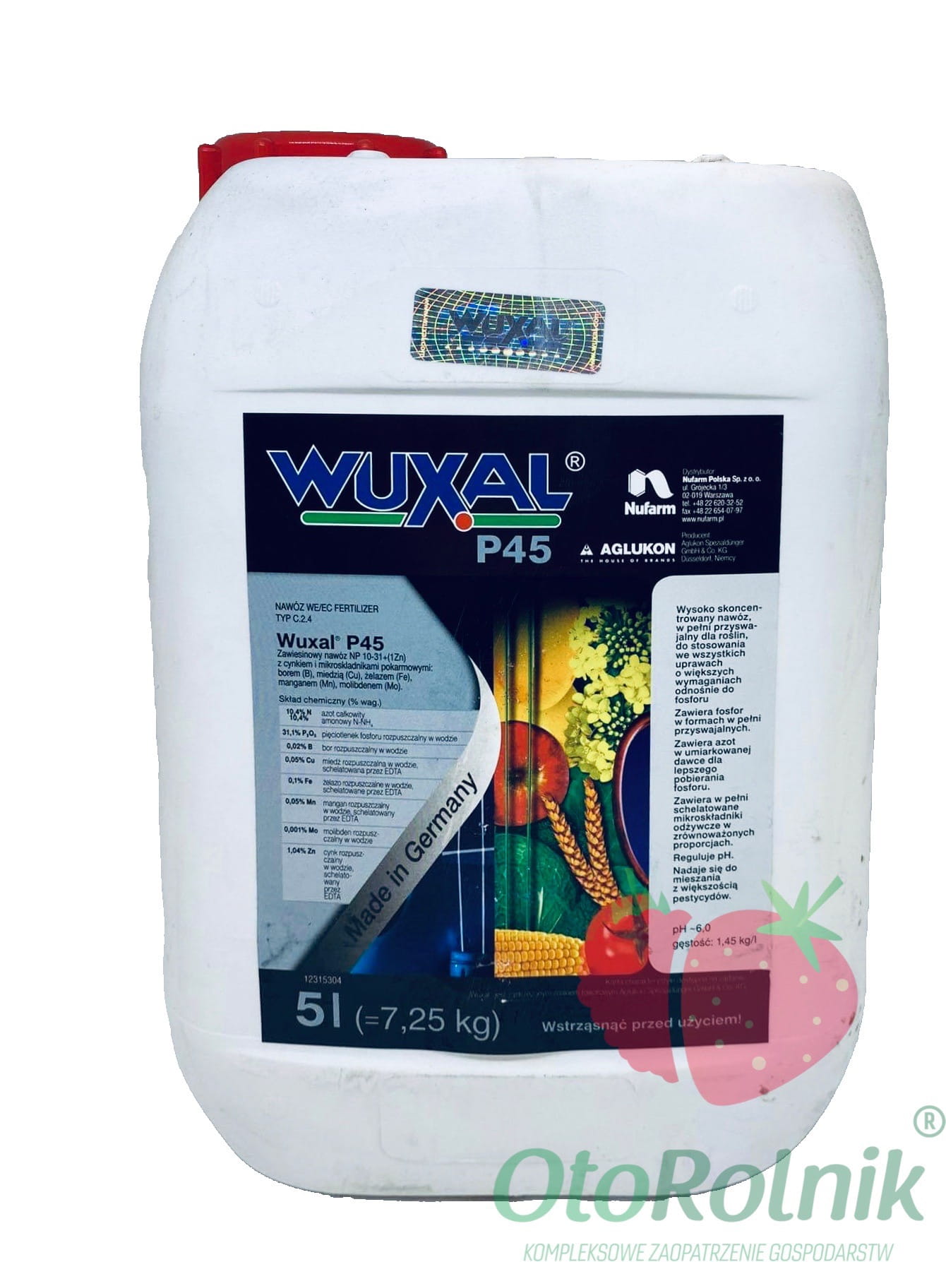 Wuxal P45 jest innowacyjnym zawiesinowym nawozem dolistnym do stosowania we wszystkich uprawach rolniczych, sadowniczych i warzywniczych cechujących się zwiększonym zapotrzebowaniem na fosfor, szczególnie w przypadkach, gdy zapotrzebowanie to nie może być pokryte poprzez nawożenie doglebowe. Niedostateczne dostarczenie fosforu przez korzenie wpływa negatywnie na plon i jest coraz poważniejszym problemem szczególnie podczas sezonów o niekorzystnym bilansie wodnym. Pobieranie fosforu z gleby może być zahamowane zwłaszcza podczas suchych: późnej wiosny i początku lata. Dodatek azotu i cynku oraz innych w pełni schelatowanych mikro-składników odżywczych zapewnia zbilansowane odżywianie roślin. Wysoka zawartość tlenku fosforu pozwala na szybkie uzupełnienie ostrych niedoborów fosforu i zapobieganie tym niedoborom w przyszłości. Wuxal P45 jest tym samym idealnym nawozem dolistnym dla skutecznego uzupełnienia programu nawożenia doglebowego. Wuxal P45 ma wyjątkowo silne właściwości buforujące – reguluje pH cieczy roboczej. Nawet przy niskim stężeniu 0,02%, początkowe zasadowe (9,0) lub kwaśne (4,0) pH jest regulowane do optymalnego poziomu.