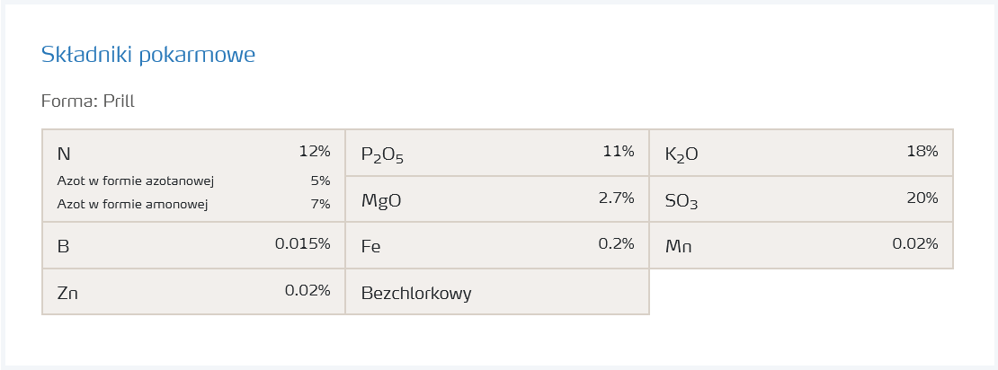 - odpowiednio dobrane formy składników pokarmowych – azot w dwóch formach, równomiernie uwalniany podczas wegetacji, fosfor z dodatkiem formy polifosforanowej, aktywnej i nieulegającej silnemu wiązaniu przez glebę, potas w formie siarczanowej, poprawiającej jakość plonu u wszystkich grup roślin, szczególnie ważny dla grupy upraw wrażliwych na chlorki