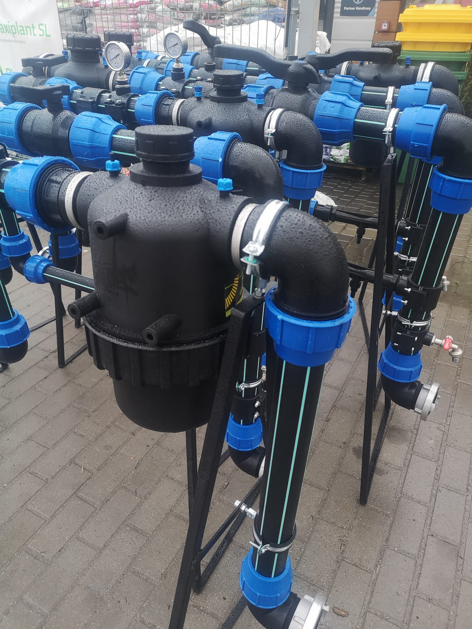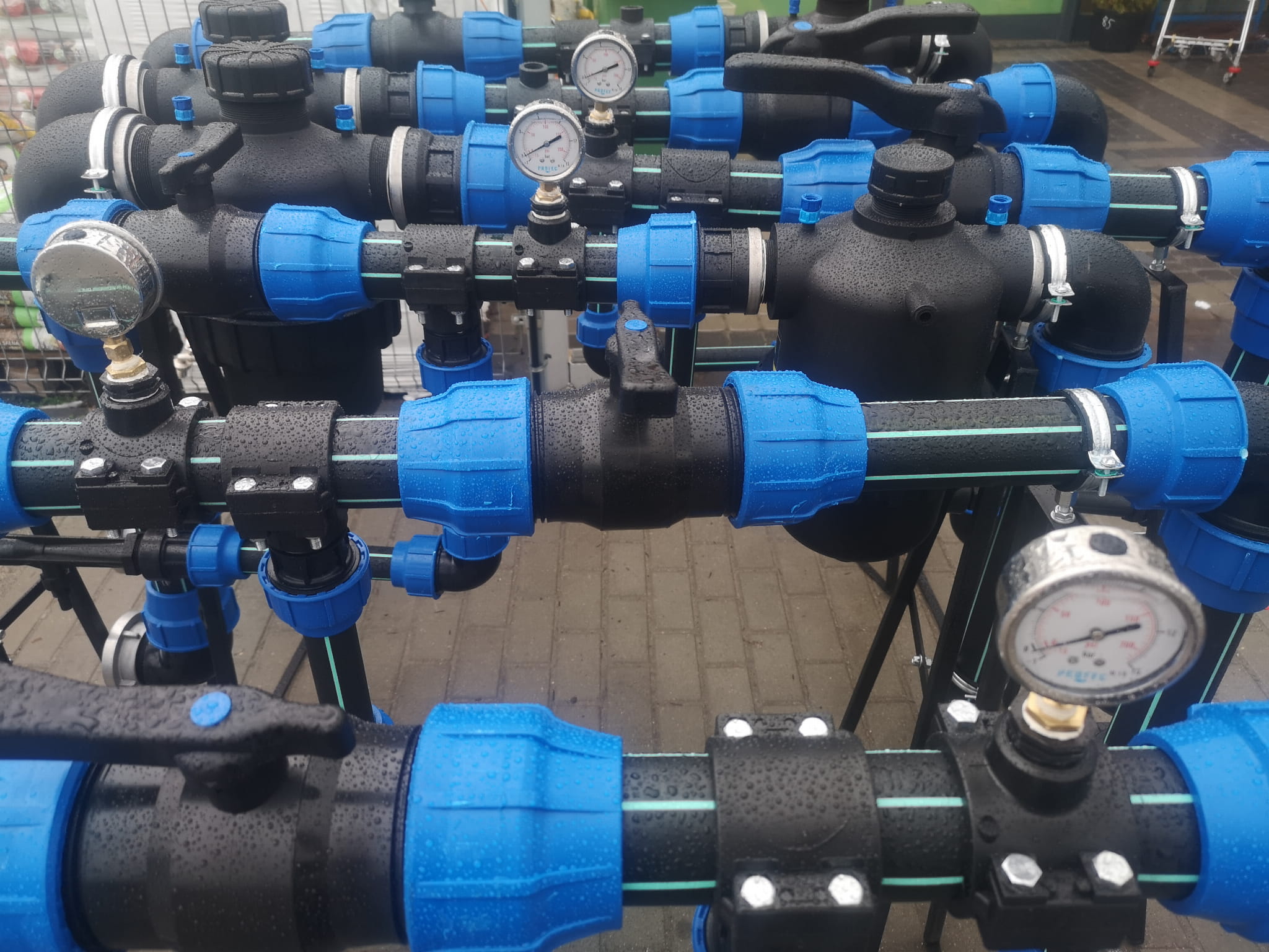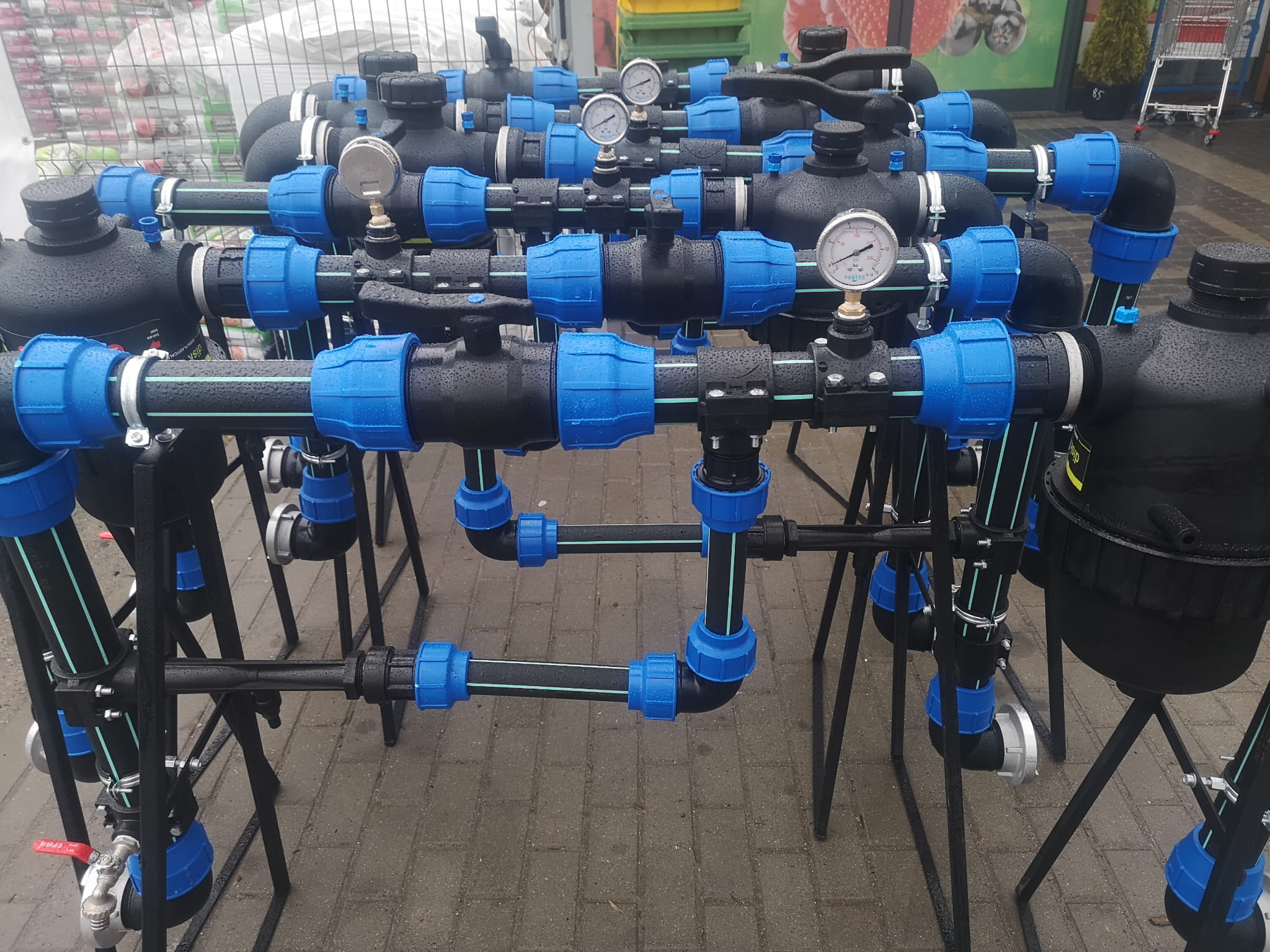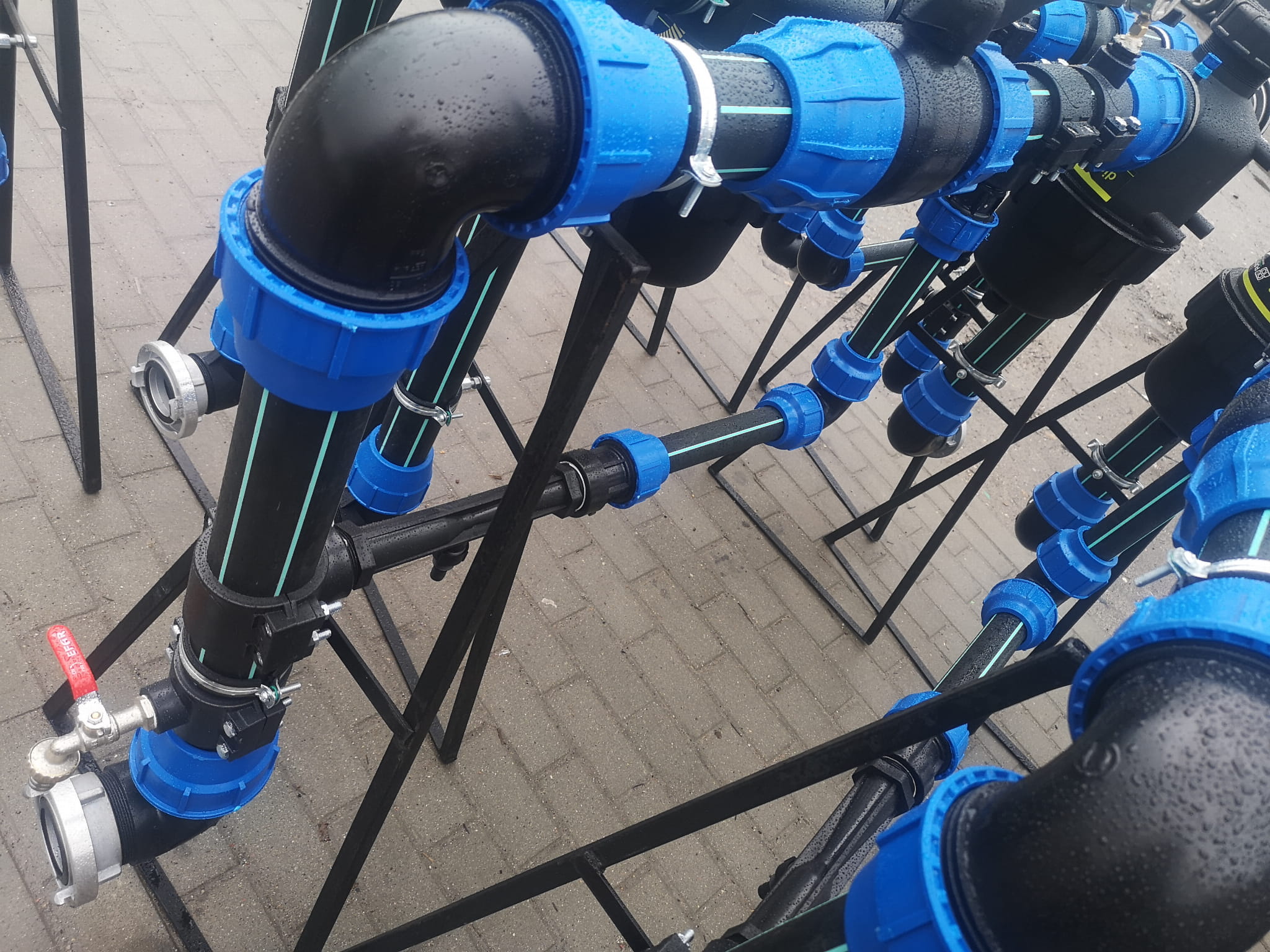 Stacja filtrująco 75-dozująca na mobilnym stojaku pozwala na szybkie przemieszczanie między sekcjami oraz na bezpośrednie przyłączanie do źródła wody i wodociągu doprowadzającego wodę w nawodnieniach.